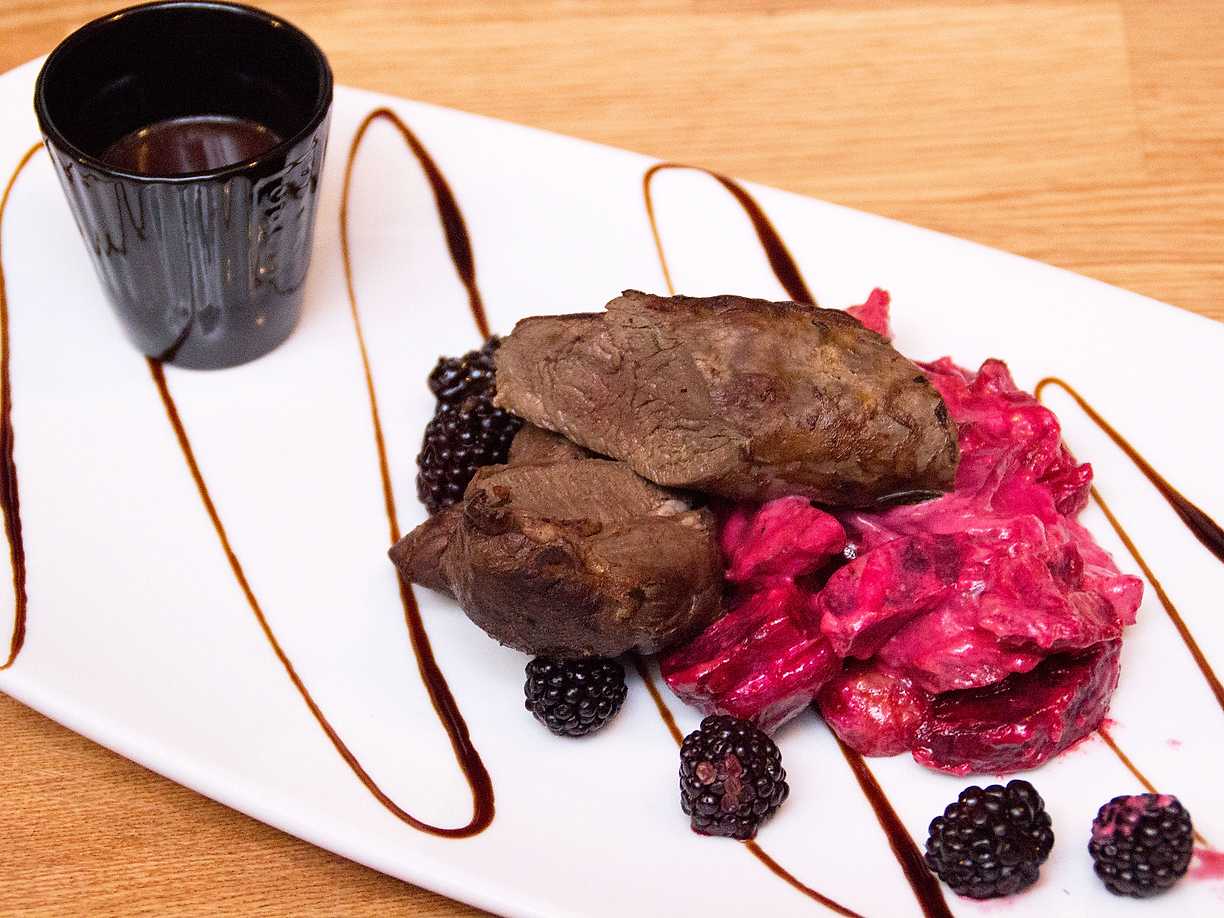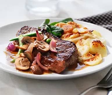 Ryggbiff med potatis- och jordärtskocksgratäng och svampsky