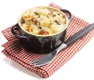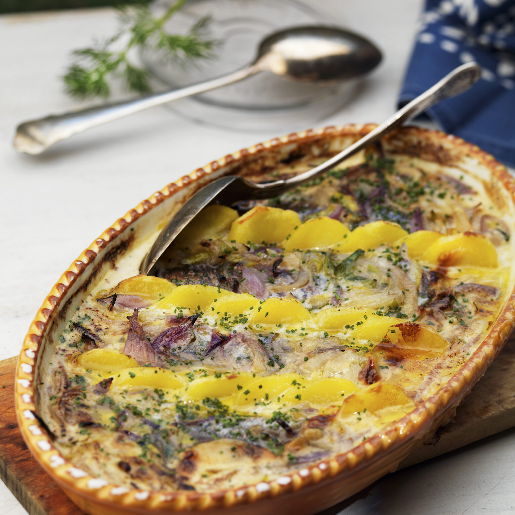 Gratäng med potatis, jordärtskocka, kantareller och rödbetsblast