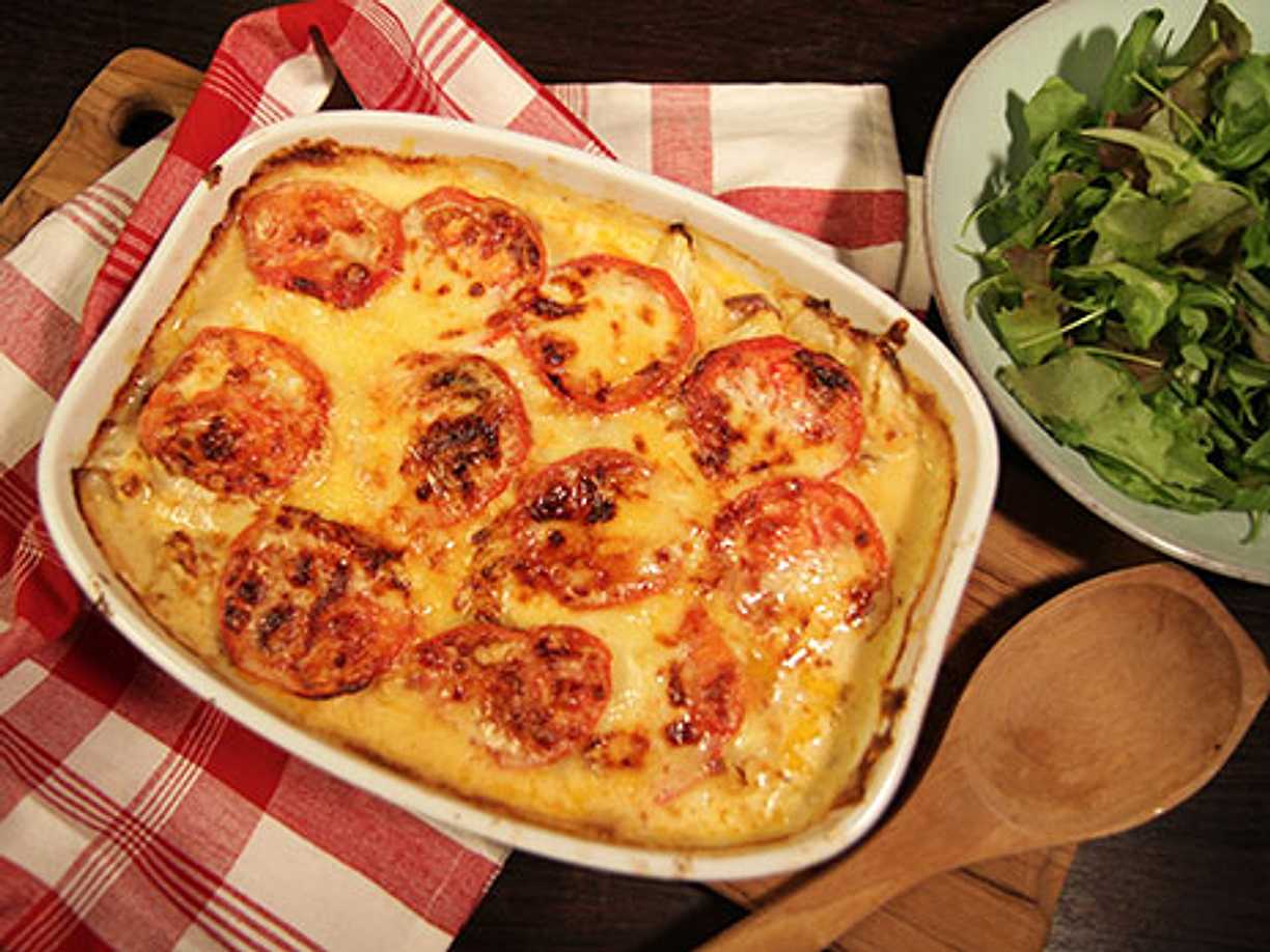 Grillad kyckling steak med ost- och tomatgratinerad potatis
