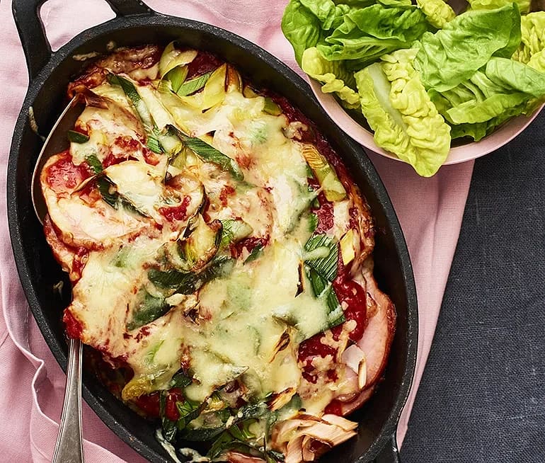 Pestogratinerad kassler med tomat