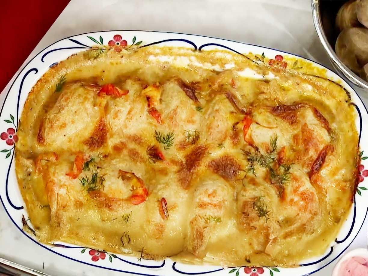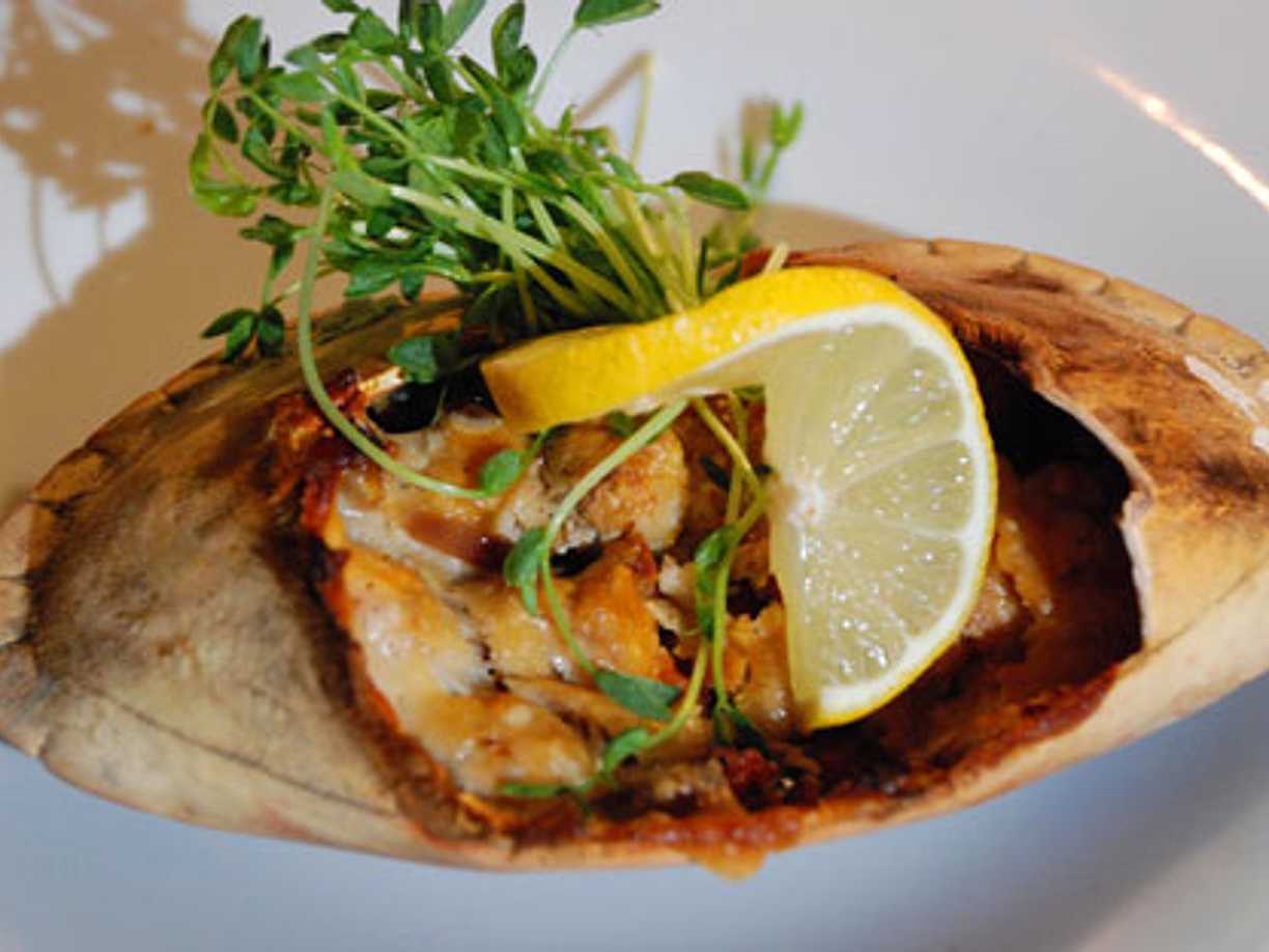 Gratinerad hummer med prästost, tomat, dragon och lök