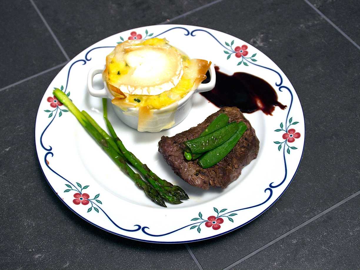 Oxfilé och gratinerat basilikamos, serveras med balsamicosås