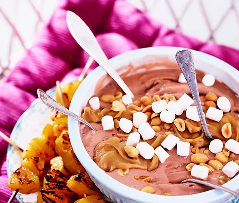 Kolasås ”rocky road” till mjukglass och grillad ananas