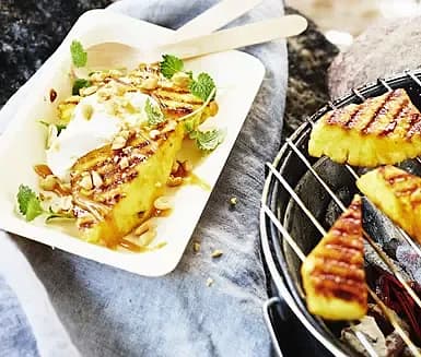 Grillad ananas med glass, honungsrostade nötter och hackad choklad