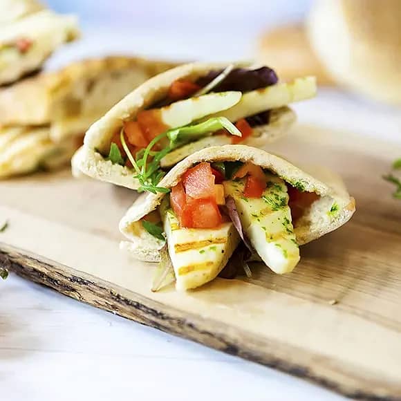 Grillad halloumi med ugnsbakad frukt- och grönsakssallad
