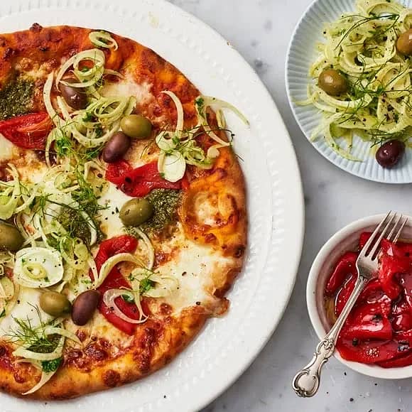 Pestopizza med mozzarella, grillad paprika och marinerad fänkål