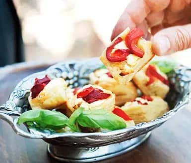 Smördegsflarn med getost, grillad paprika och tapenade