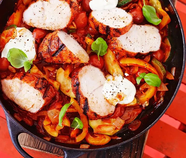 Grillad kycklingfile med ugnsrostade grönsaker och fetaröra