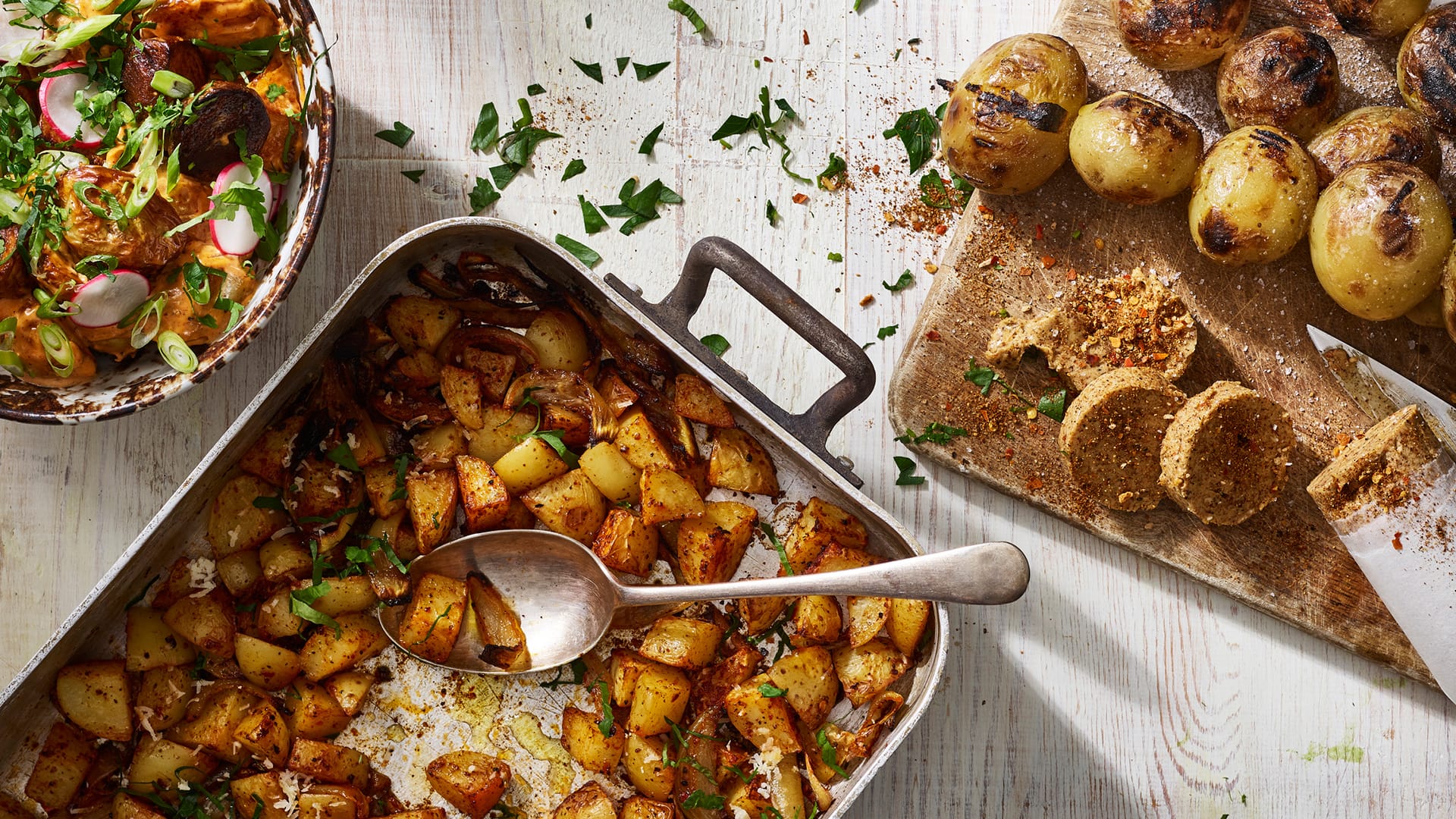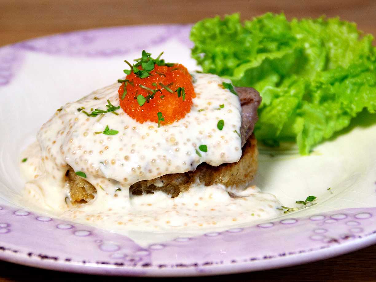 Grillad biff med pepparrotssmör, krossad färskpotatis och picklade senapskorn