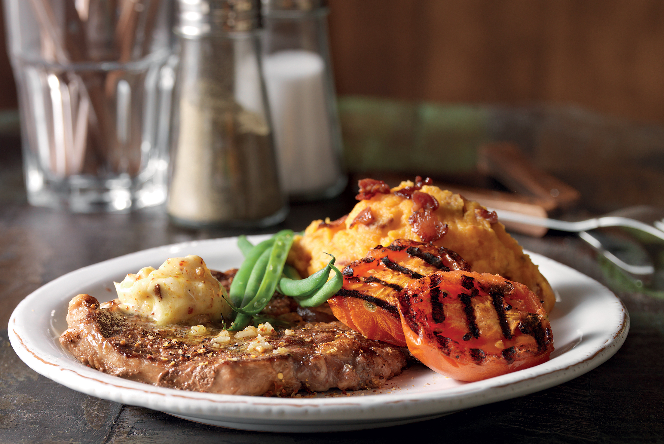 Rib Eye Steak med sötpotatismos och grillade grönsaker