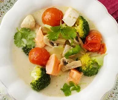Fiskgryta med kokosgrädde, grön curry och limeyoghurt