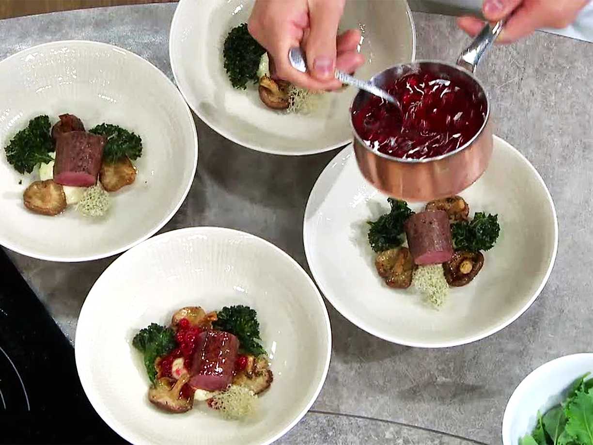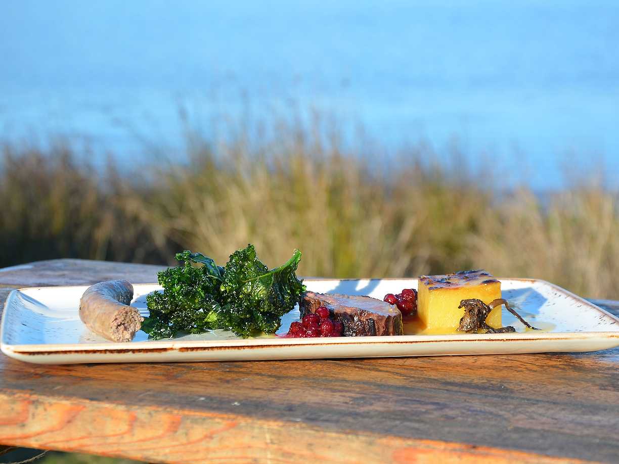 Stekt renytterlår med sveciakräm, svensk shiitake, friterad grönkål och lav samt brynt lingonsmör