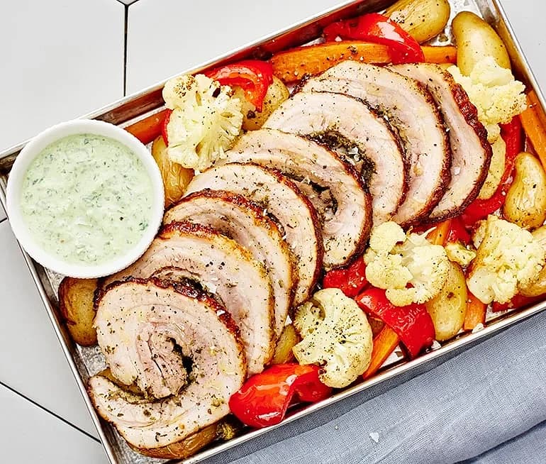 Porchetta med rostade grönsaker och spenat- och citroncrème
