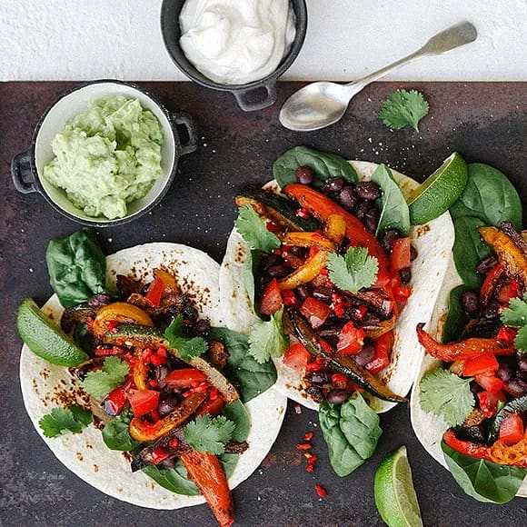 Fajitas med rostade grönsaker, svarta bönor och guacamole