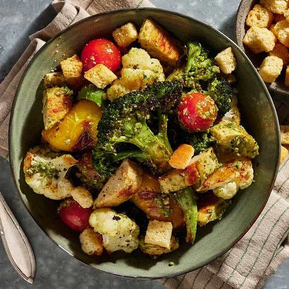 Ugnsgrillade grönsaker med tonfiskdressing och krutonger