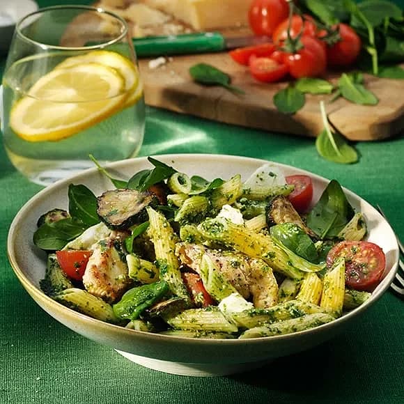 Snabb pasta pesto med grönsaker och kyckling