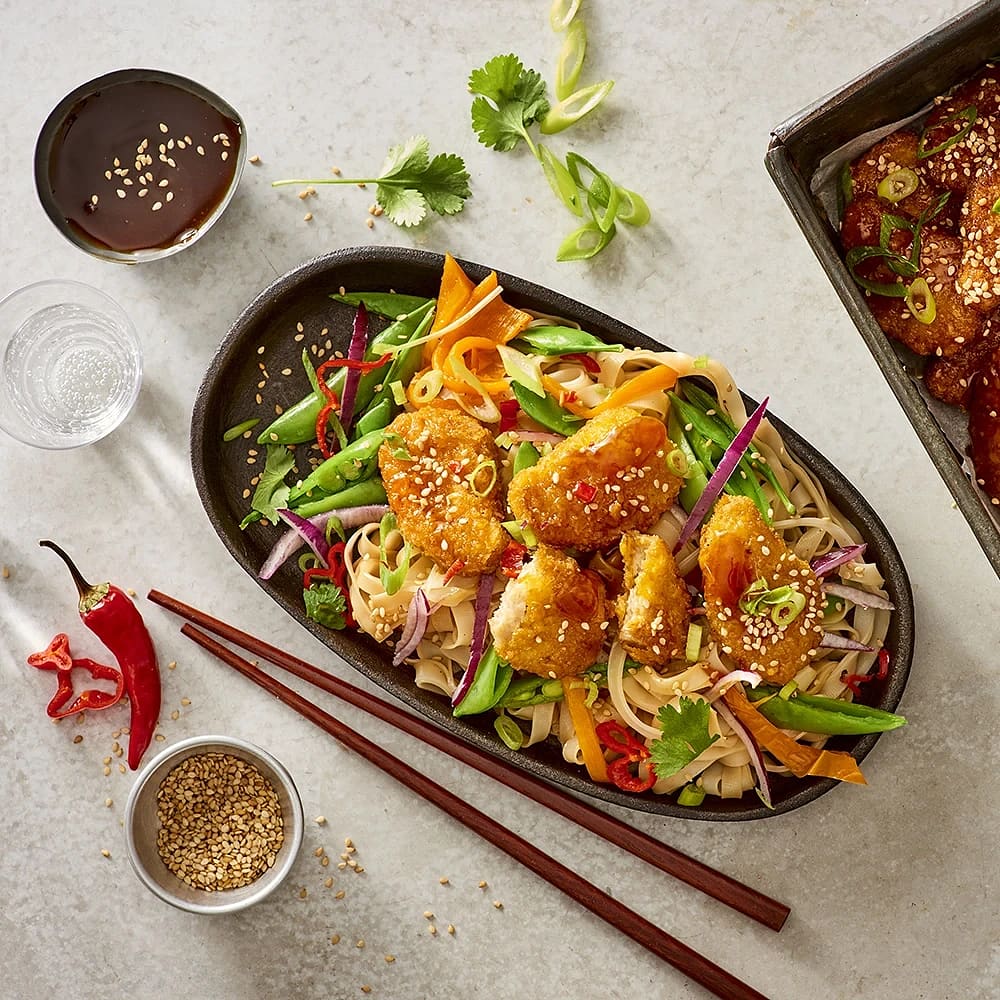 Vegonuggets med teriyakinudlar och wokade grönsaker