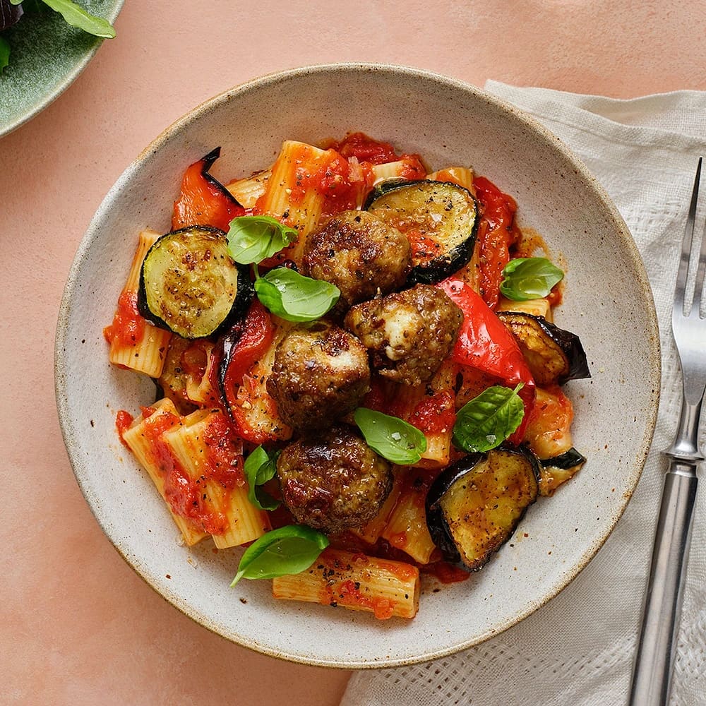 Köttbullar i tomatsås med rostade grönsaker och pasta