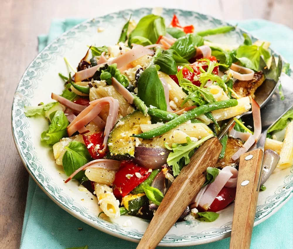 Pastasallad med rostade grönsaker, kalkon och fetaost
