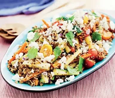 Quinoasallad med rostade grönsaker, lax och rödlökskvarg