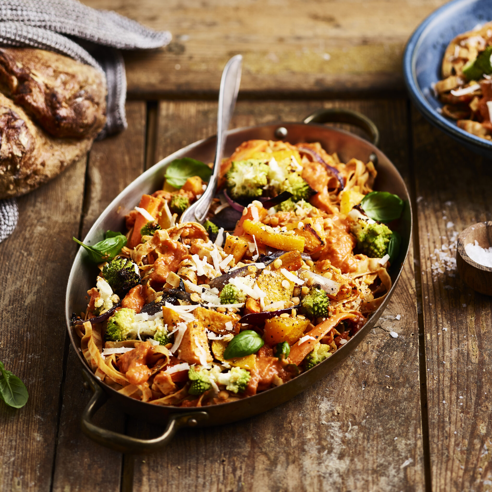 Bönpasta med tomatsås och honungsrostade grönsaker