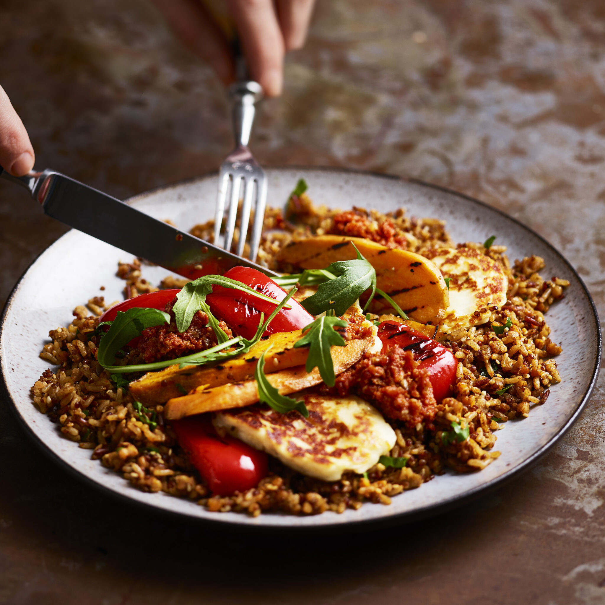 Ris- och sesammix med grillade grönsaker, halloumi och tomatpesto