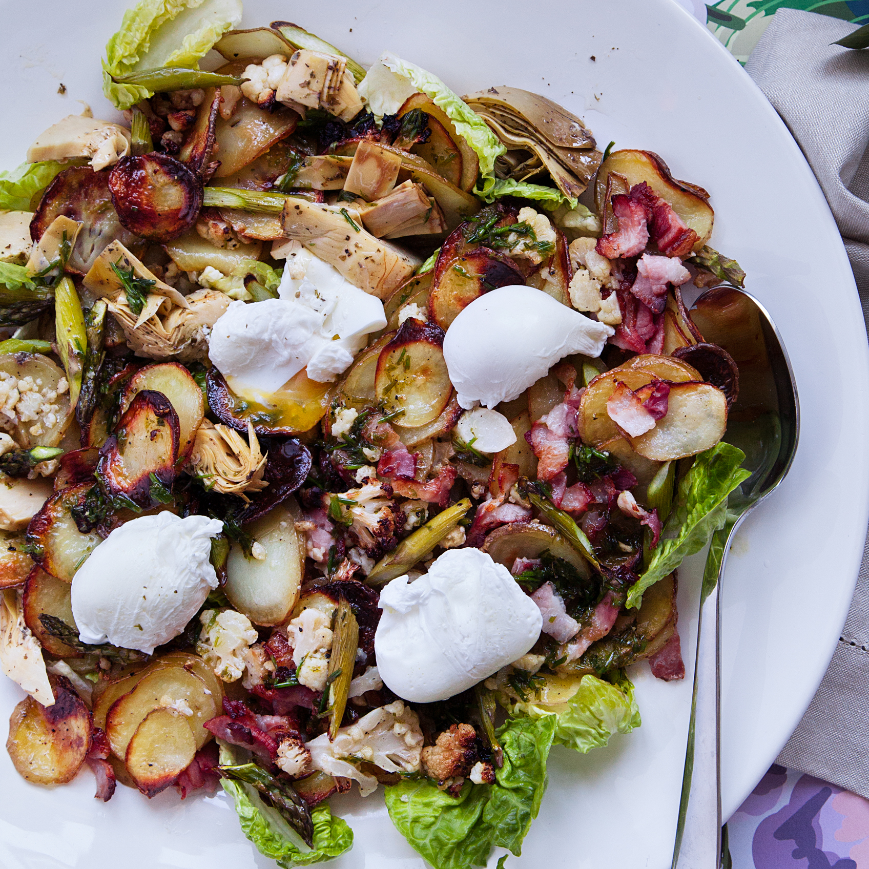 Rostade grönsaker med krispiga hasselnötter, sparris och pocherat ägg