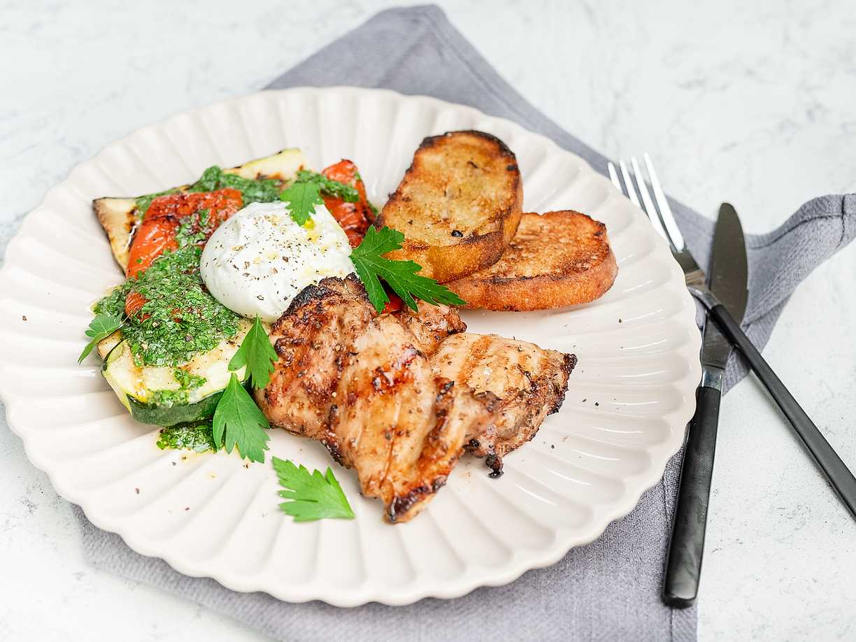 Grillad kyckling med grillade grönsaker och burrata