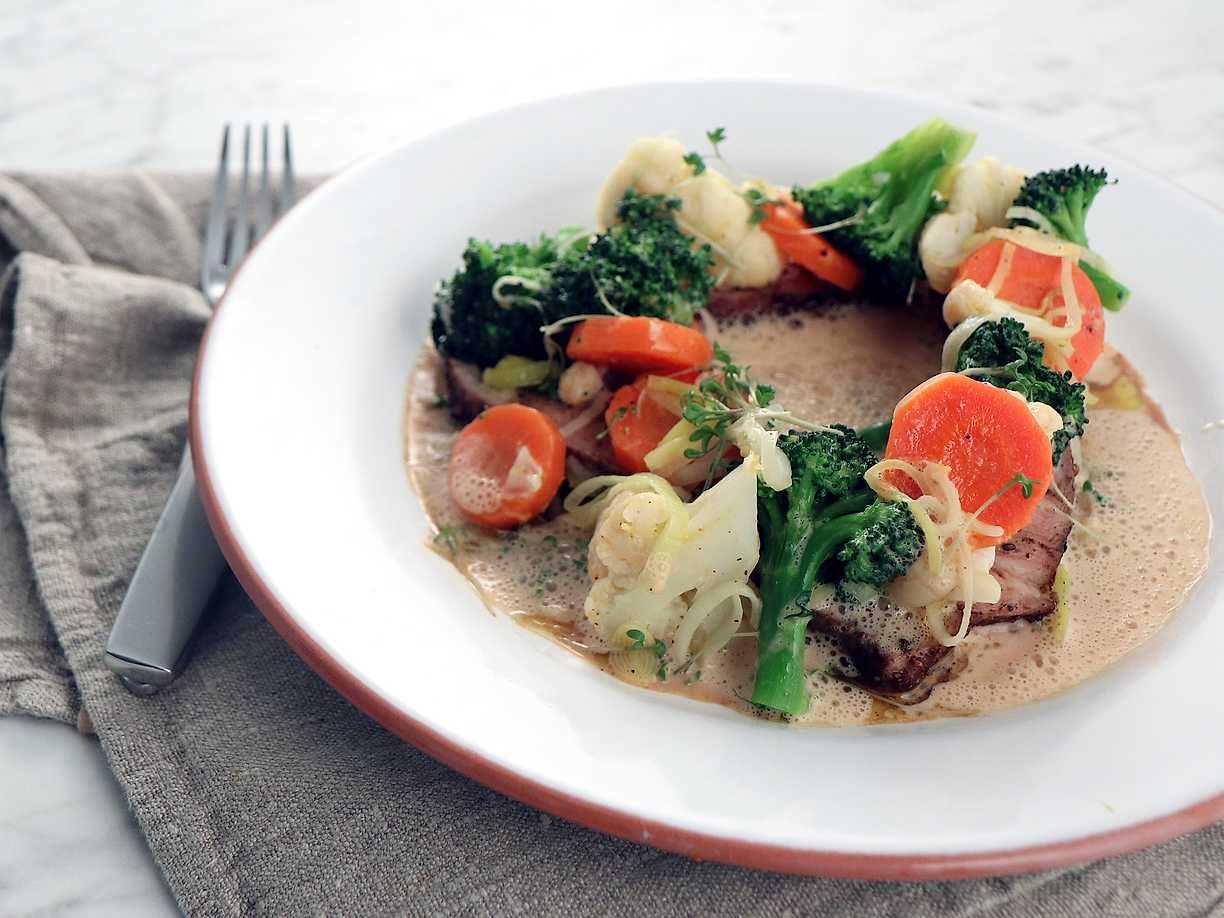 Kryddstekt fläskkarré med kokta grönsaker och gräddsås
