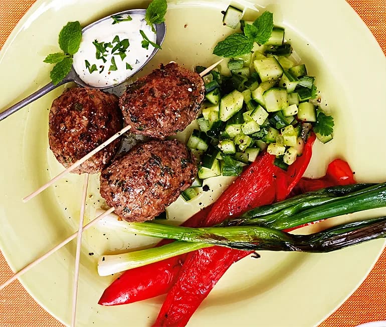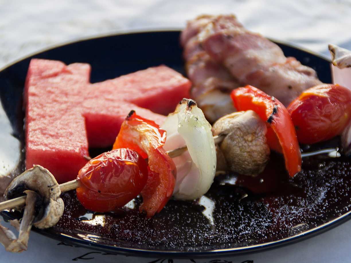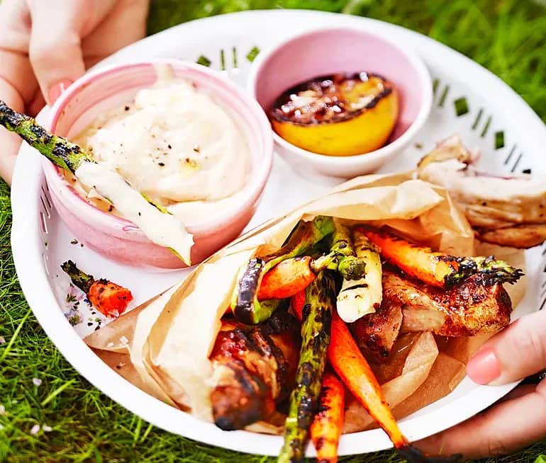 Fisk- och skaldjursspett med aioli och grillade grönsaker