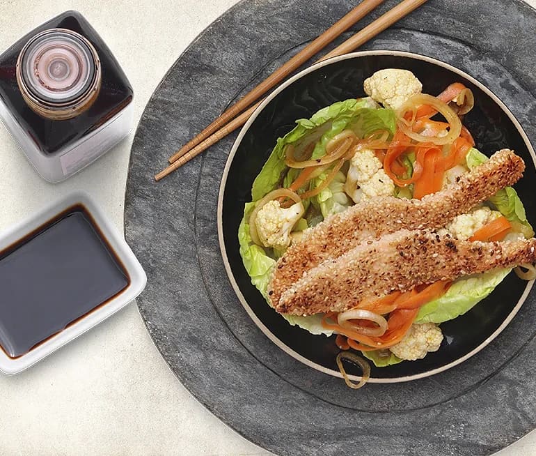 Sallad med sesamstekt lax och sojamarinerade grönsaker
