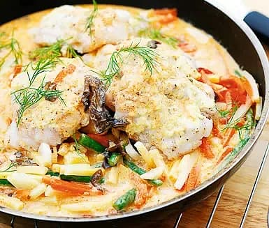 Fiskgratäng med krämig kokossås och wokade grönsaker