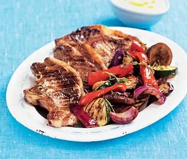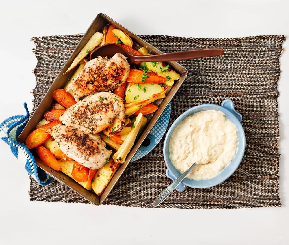 Kyckling med ugnsbakade grönsaker och potatis med tzatziki
