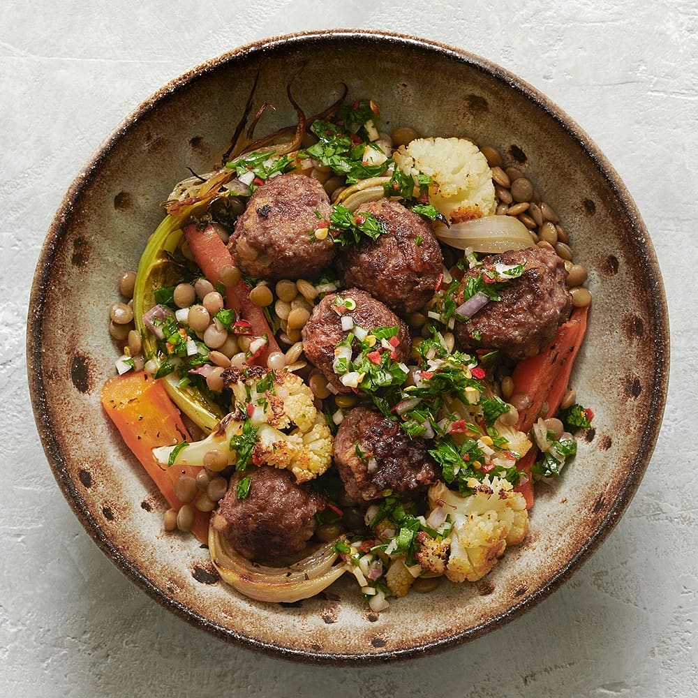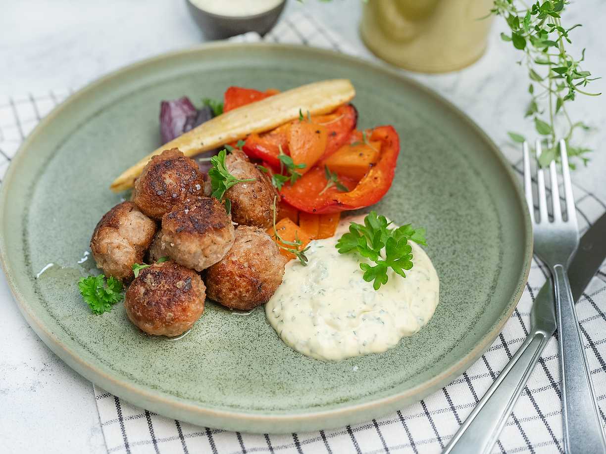 Köttbullar 50/50 med rostade grönsaker och kall timjansås