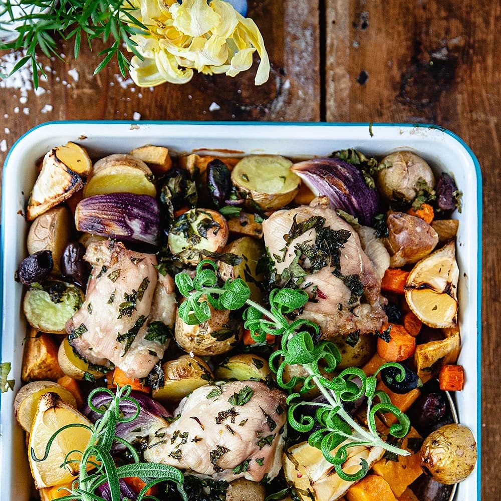 Allt på en plåt – kyckling med ugnsrostade grönsaker