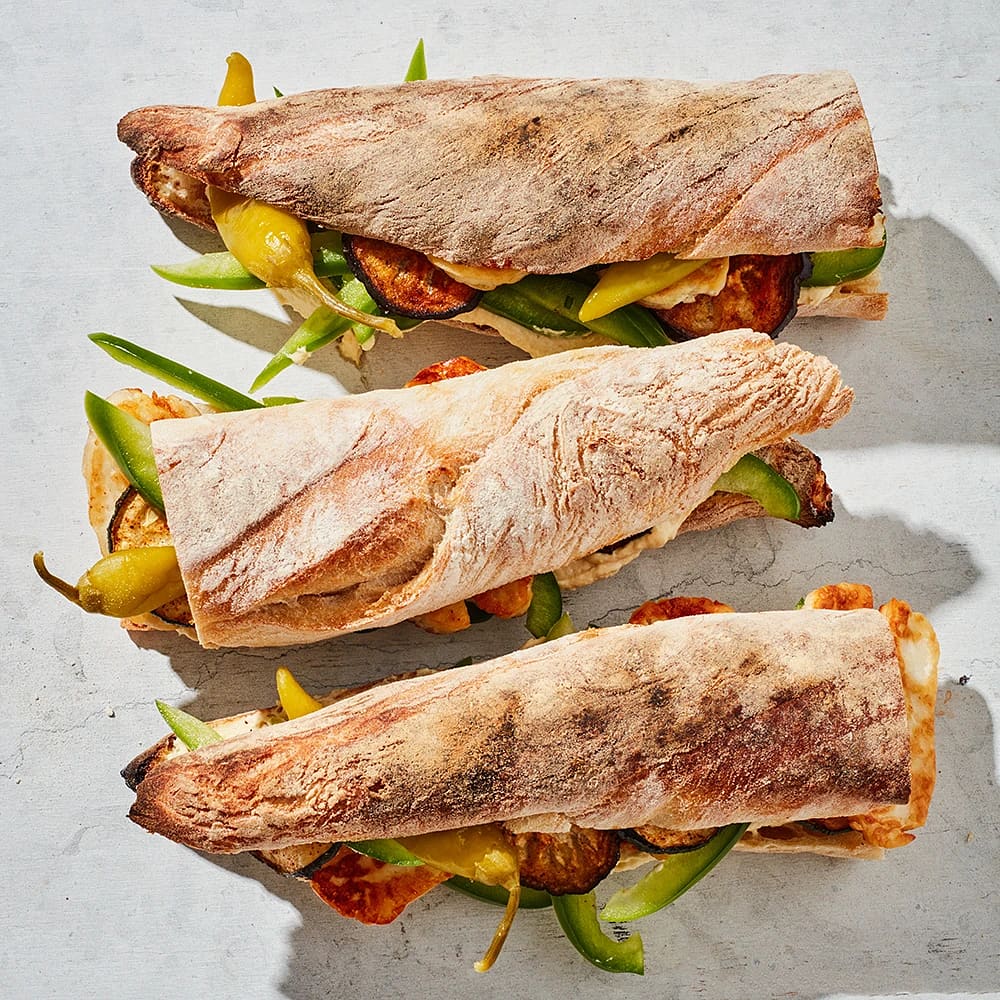 Baguette fylld med örtmarinerad kyckling och grillade grönsaker