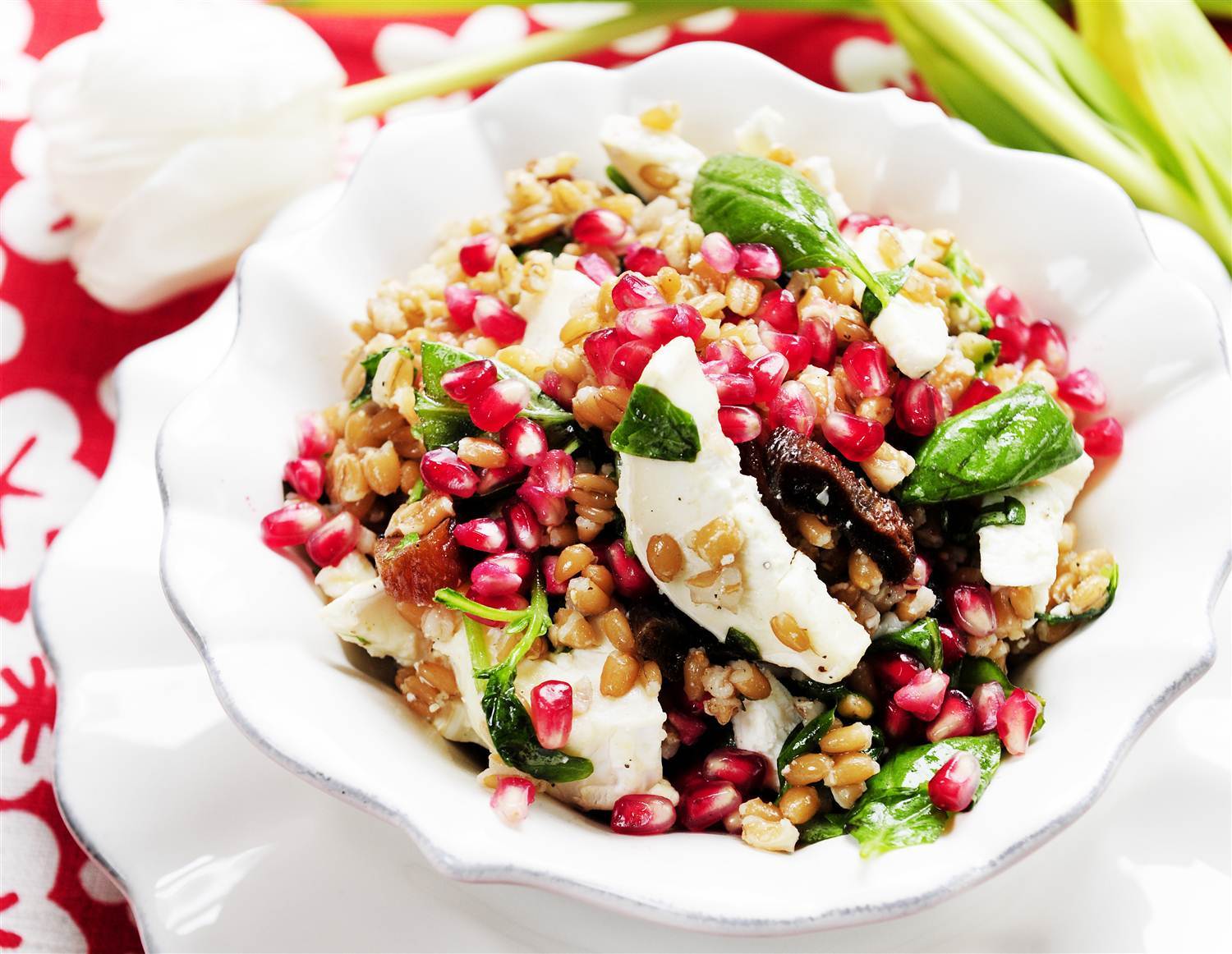 Dinkelsallad med rostade grönsaker, aprikoser och granatäpple