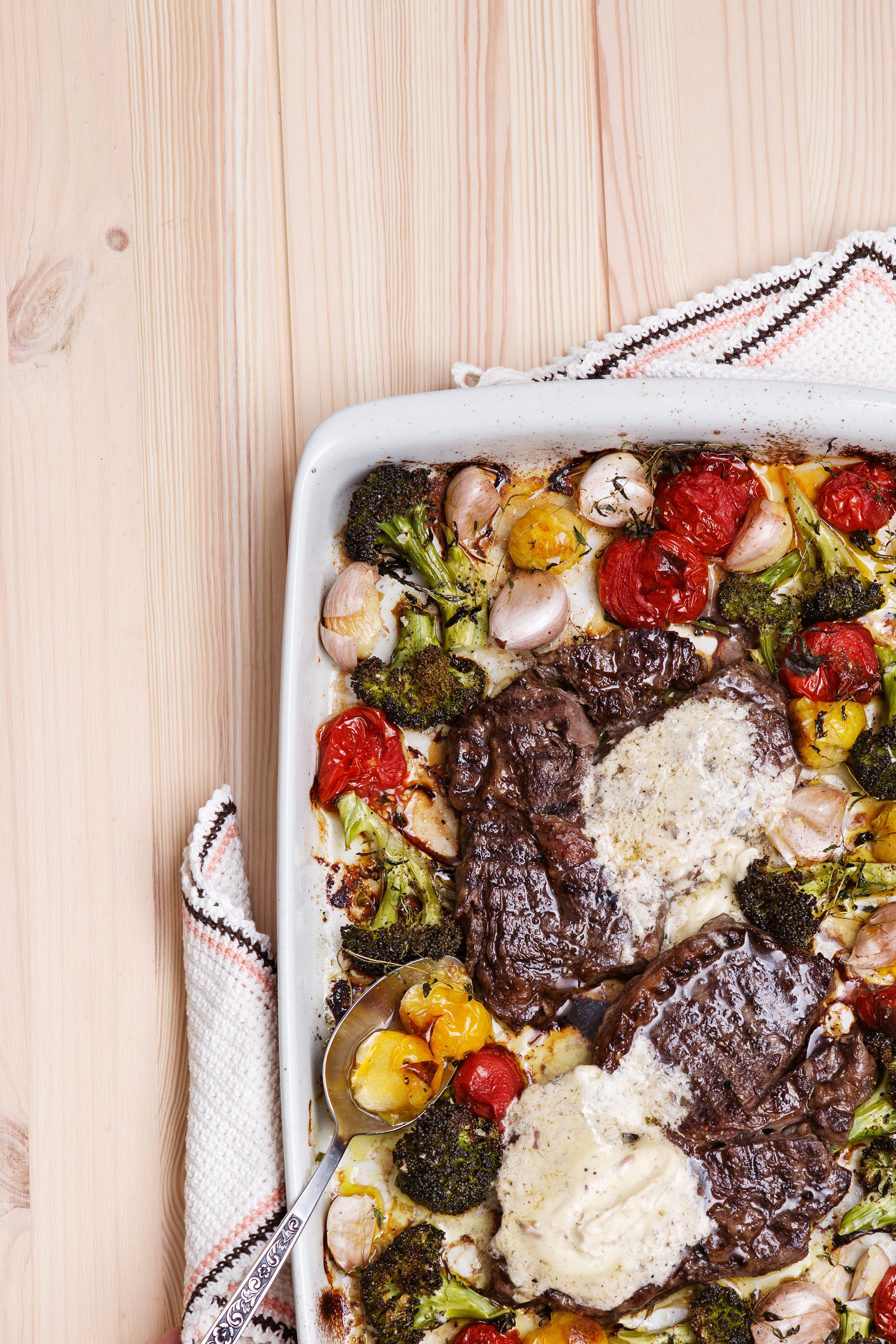 Grillad entrecote med ugnsbakade grönsaker och rödvinssås