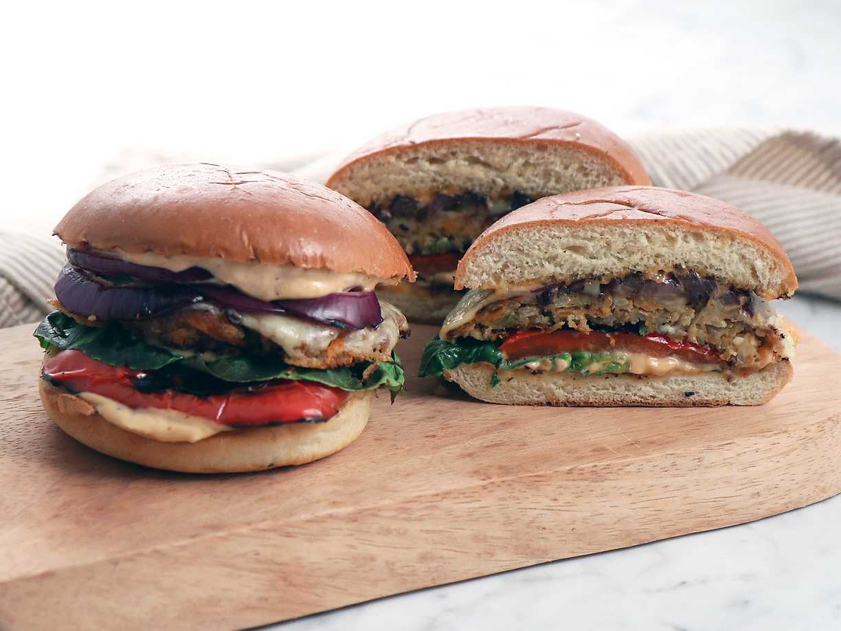 Linsburgare med grillade grönsaker och chipotlemajonnäs