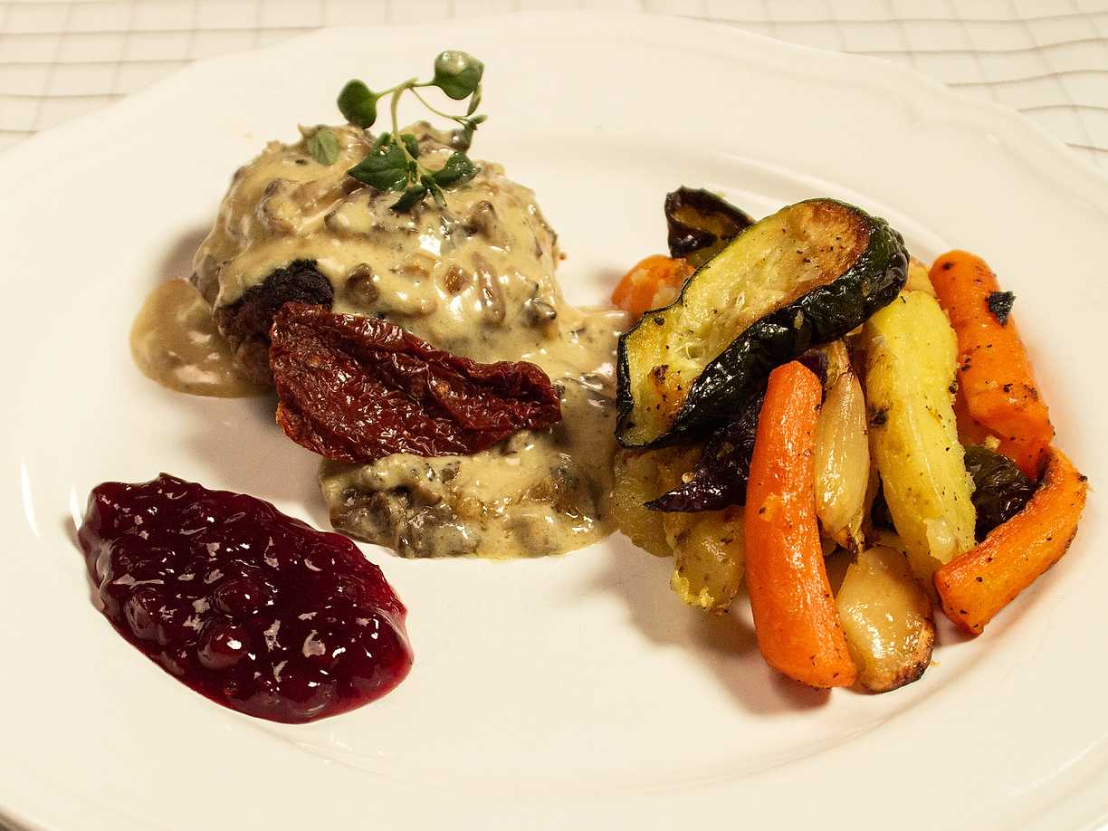 Vråas vilda biffar med rostade grönsaker och svampsås