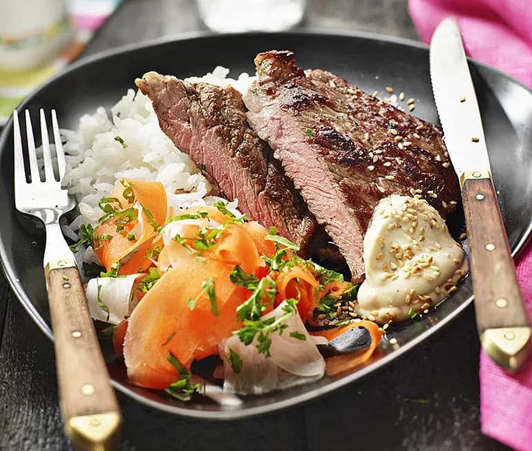 Minutbiff med sojamajonnäs och inlagda grönsaker