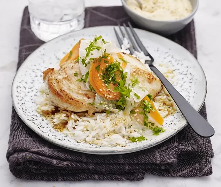 Kyckling med sojamajonnäs och picklade grönsaker