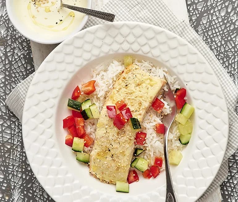Bakad torsk med HP-sauce och grillade grönsaker