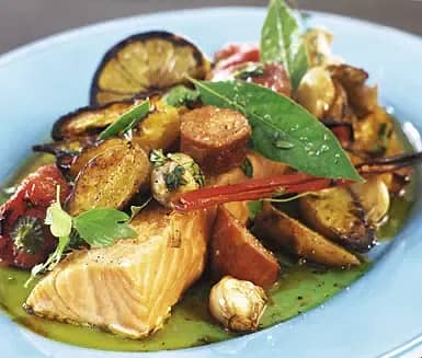 Chorizoconfiterad lax med rostade grönsaker