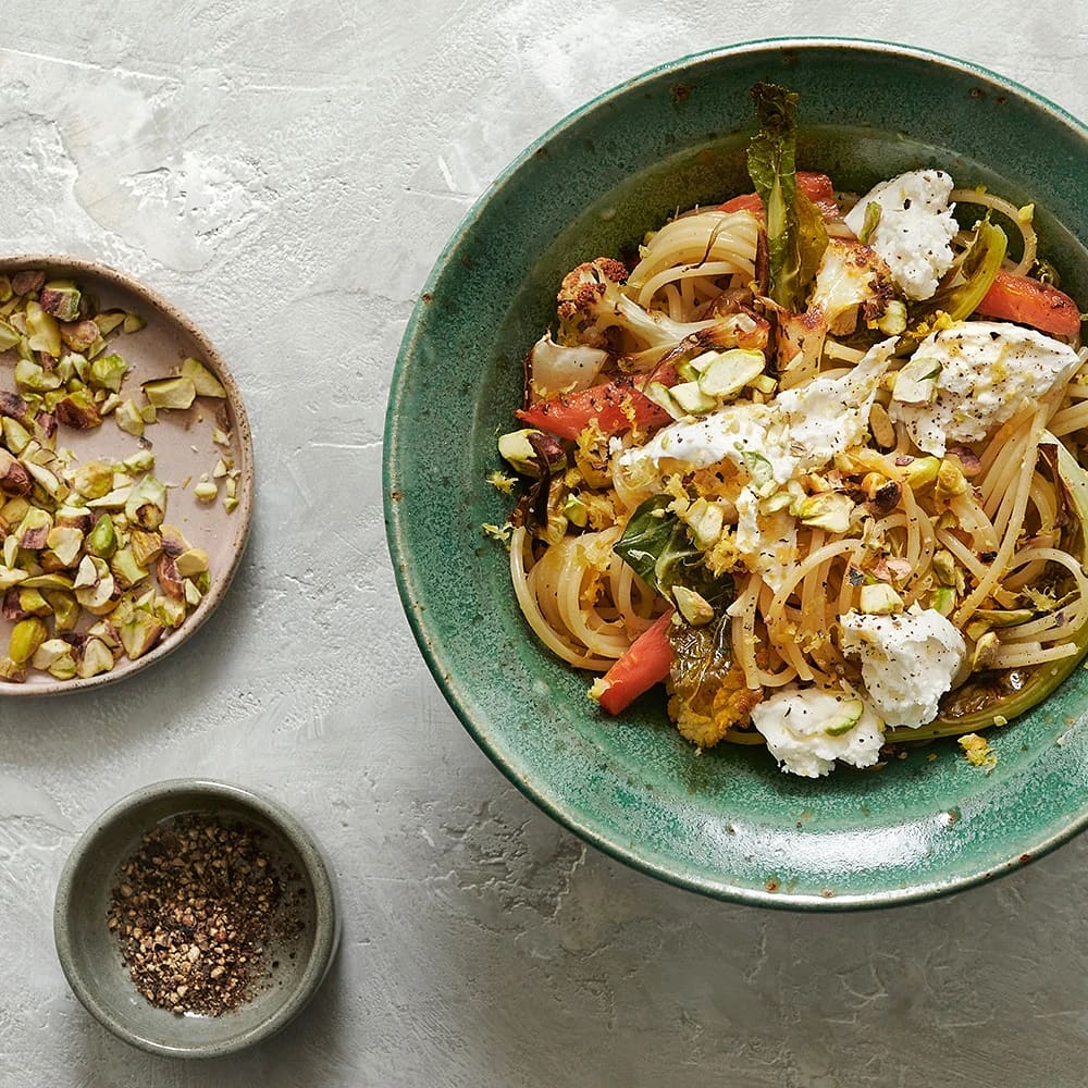 Vegetarisk pastarätt med rostade grönsaker