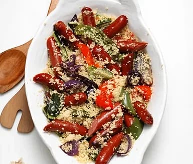 Korv med varm couscoussallad och rostade grönsaker