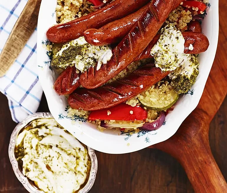 Rostade grönsaker med pesto och lammkorv
