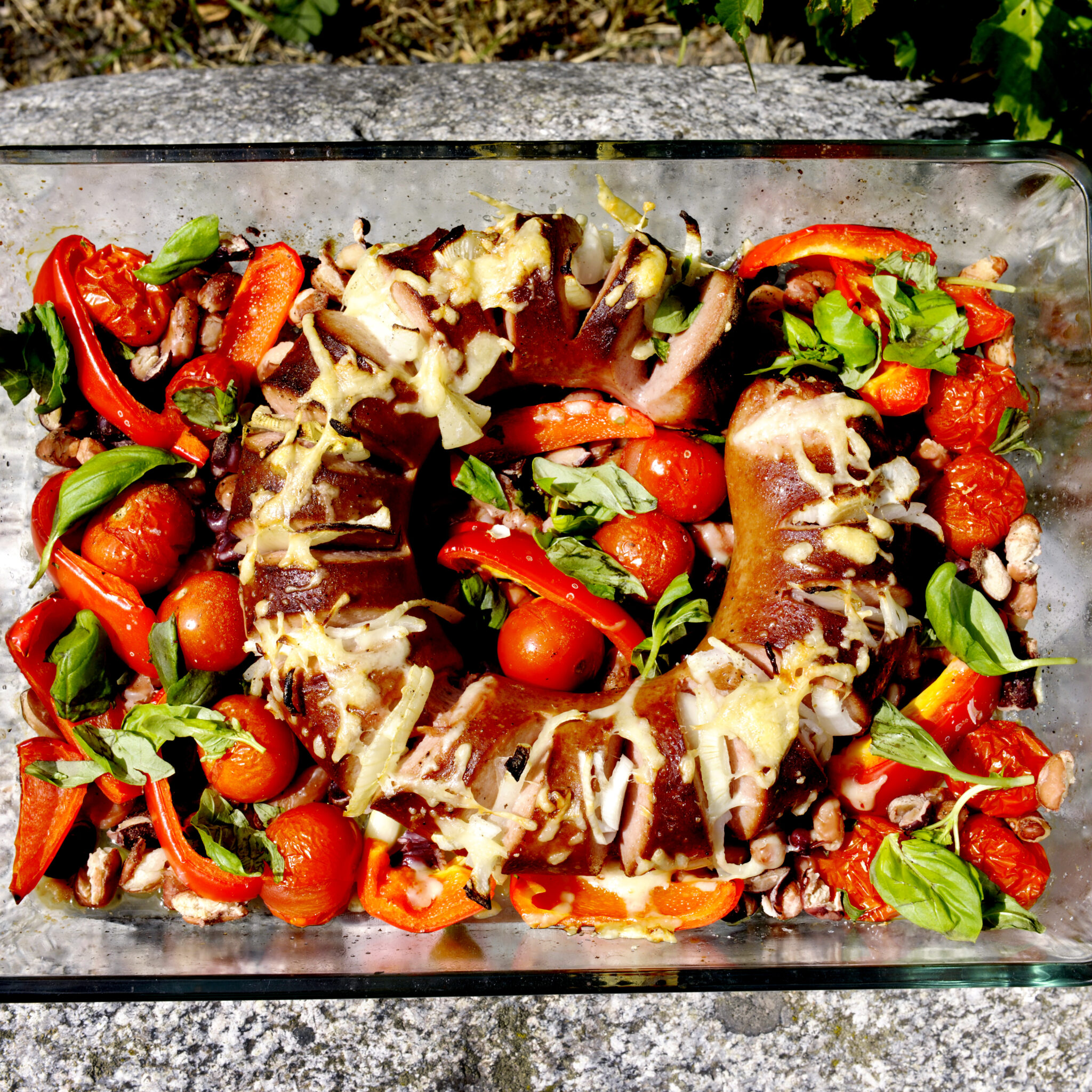 Ugnskorv med grönsaker och bönor