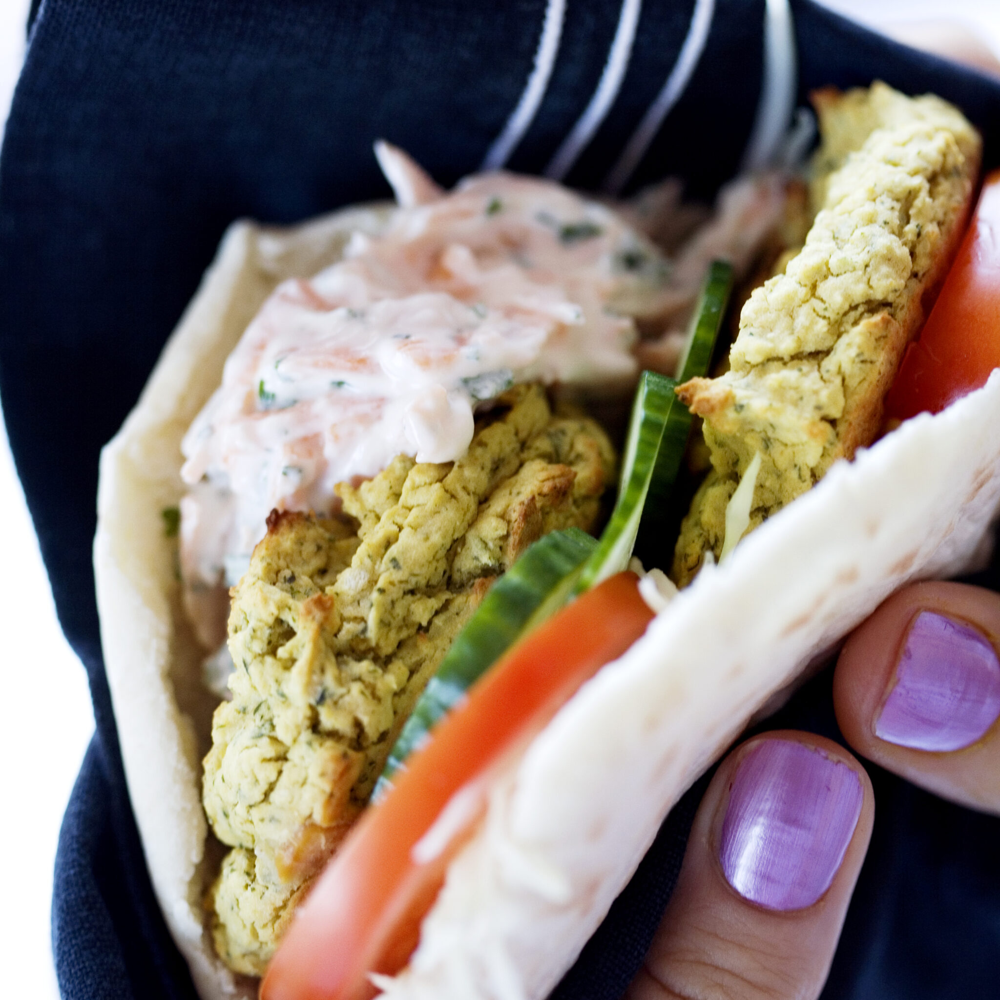 Falafel i pitabröd med morotstzatziki och grönsaker