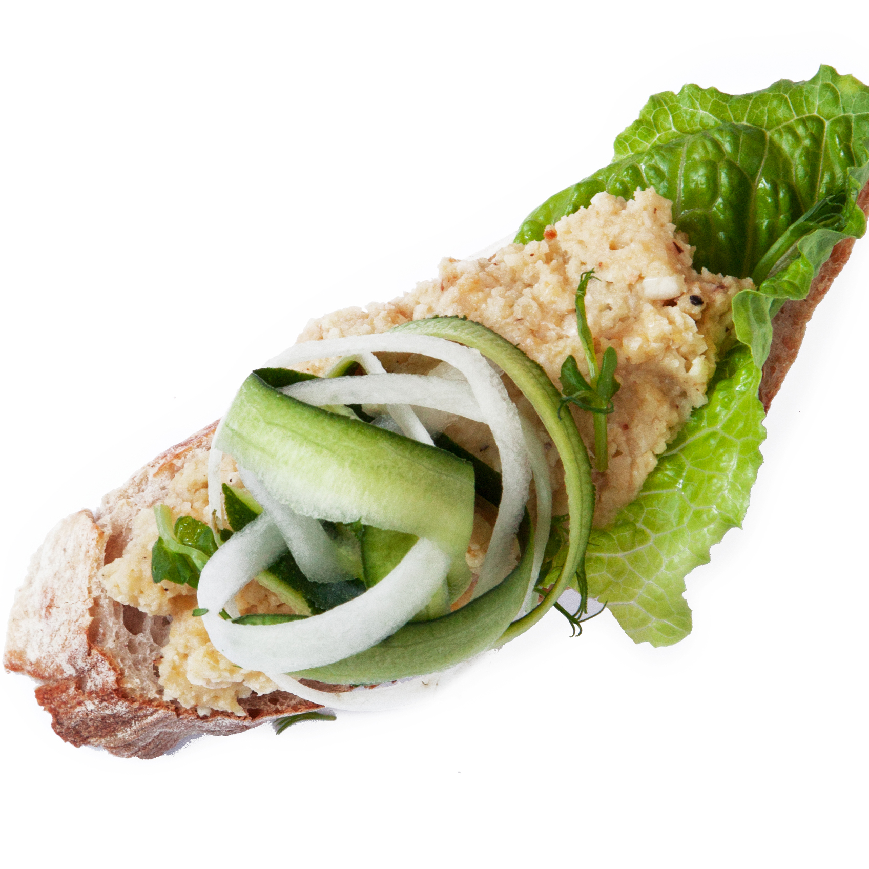 Rostad blomkålshummus på surdegsbröd med svarvade grönsaker och ärtskott